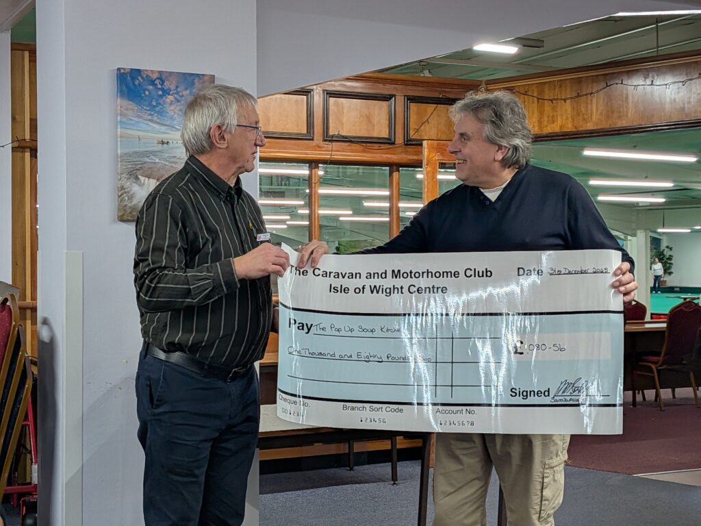 The Isle of Wight Centre of the Caravan and Motorhome Club was proud to present a cheque for £1,080.56 to Trevor Blaney of The Pop-Up Soup Kitchen at our Breakfast meeting in January 2026. Each year the centre chooses a small charity with local links to support and our members through donations, raffles and social events collect over the year for that charity. This year the cheque was presented by our chairman Mike Butler.